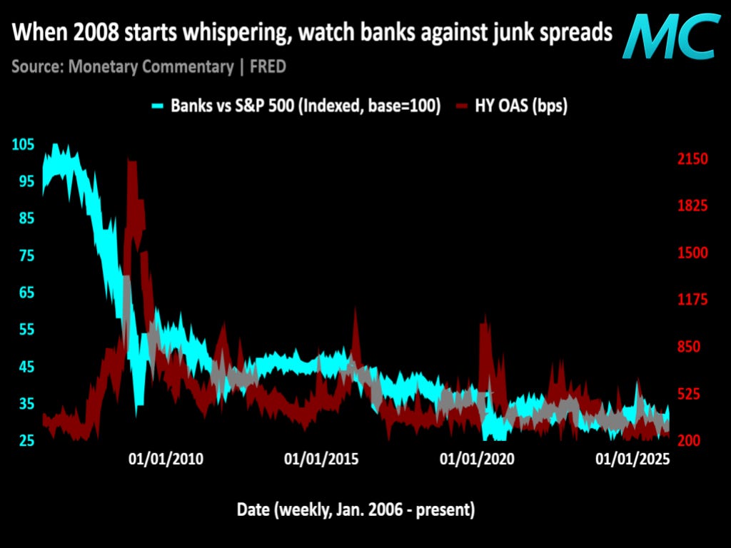 Bank stocks usually sniff out balance-sheet stress before high yield spreads fully price it.